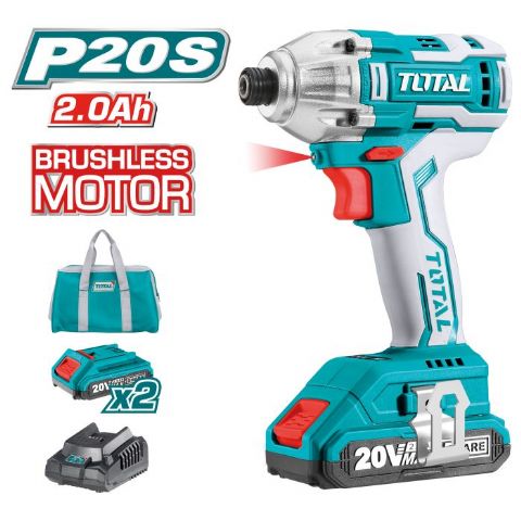 Atornillador de impacto a batería de 20 V. Motor Brushless sin escobillas. Inserción hexagonal 1/4''. Par máx de 170 Nm. RPM 0-1300 / 0-2100. Percusiones 0-3300. Luz LED. Incluye 2 baterías de 2 Ah, cargador y bolsa de transporte.