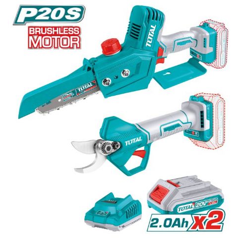 Conjunto de minisierra de cadena brushless y tijera de poda brushless de 20V. Minisierra cadena de longitud de espada 6''. Con depósito de aceite para lubricación de cadena. Tijera de poda de 25 mm de apertura máxima. Incluye 2 baterías de 2Ah y cargador. Presentación en caja de cartón.