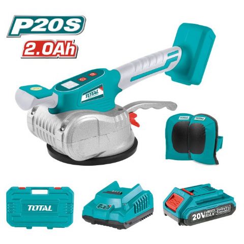 Ventosa vibradora a batería de 20 V. Frecuencia de vibrado 0-10000 rpm. Fuerza de absorción de 50 Kg. Diámetro de succión de 125 mm. Ajuste de velocidad. Incluye un juego de rodilleras. Incluye 1 batería de 2Ah y cargador.